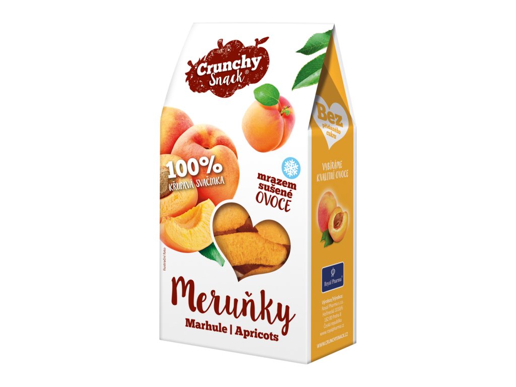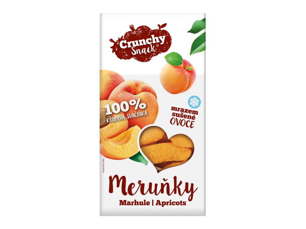 Crunchy snack lyofilizované meruňky je zdravá a křupavá svačinka plná vitaminů a minerálů bez přidaných barviv a konzervantů.